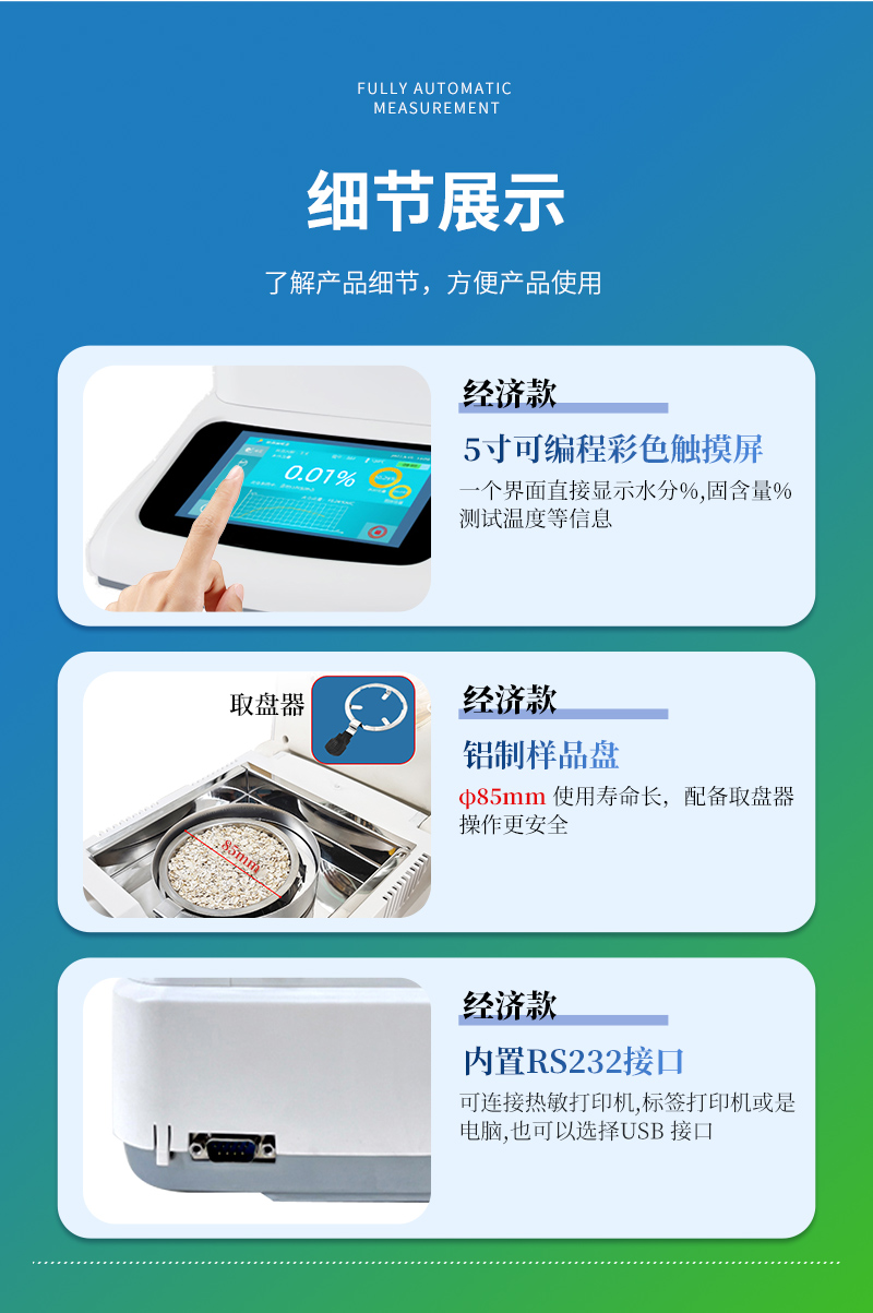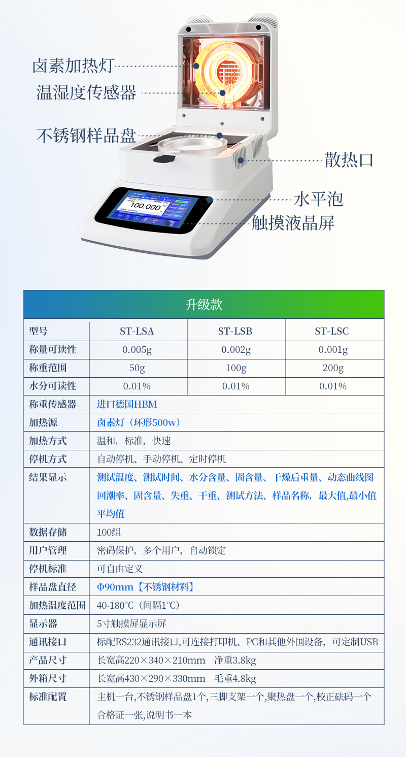 該系列快速水分測定儀應(yīng)用了國際烘箱干燥法原理,測定結(jié)果與烘箱法水分測定具有良好的一致性,工作效率卻遠(yuǎn)遠(yuǎn)高于烘箱法水分測定,一般樣品只需要幾分鐘即可測量完畢,因此受到廣大用戶的青睞與好評(píng)。