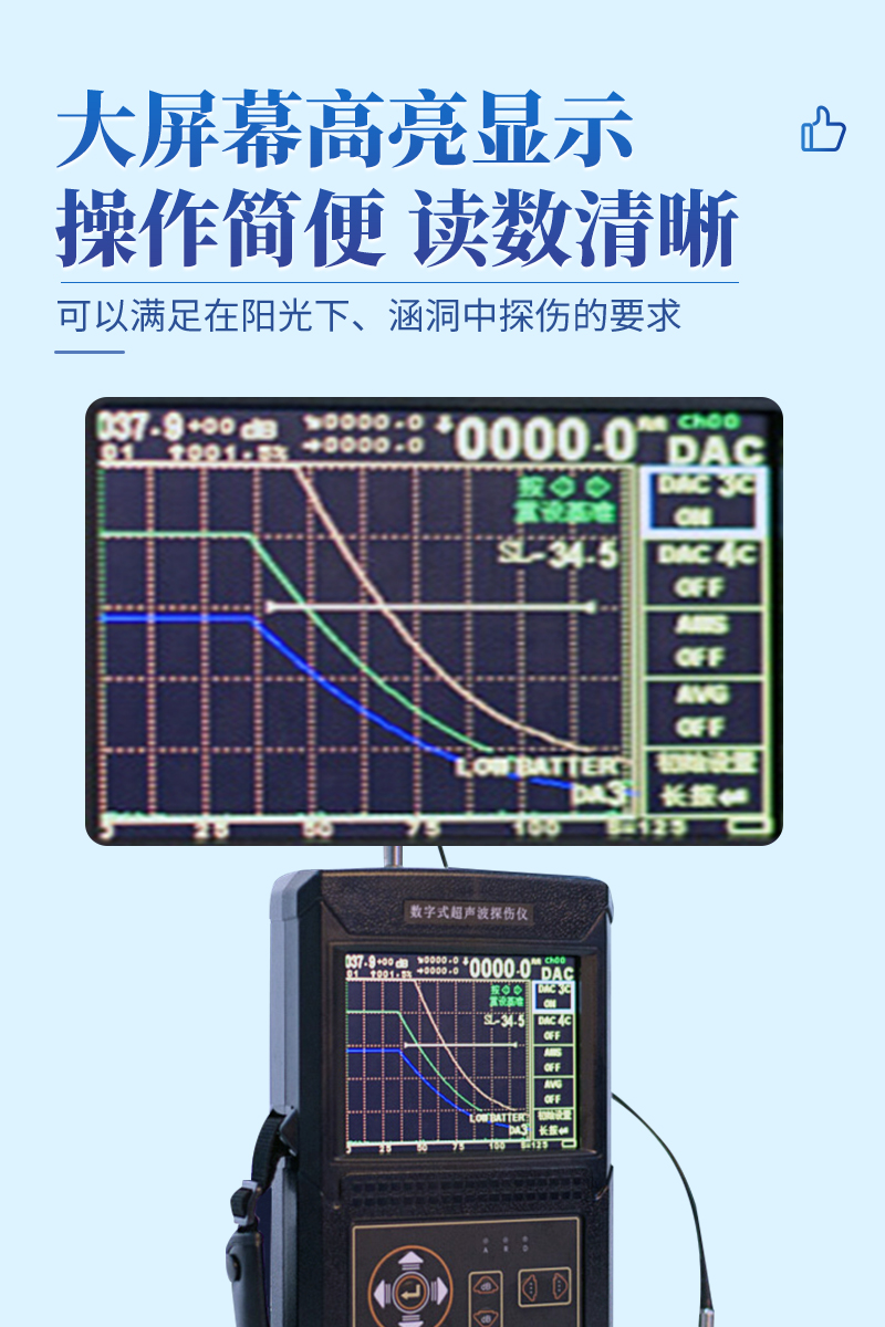 大屏幕高亮顯示,可以滿足在陽(yáng)光下、涵洞中探傷的要求。