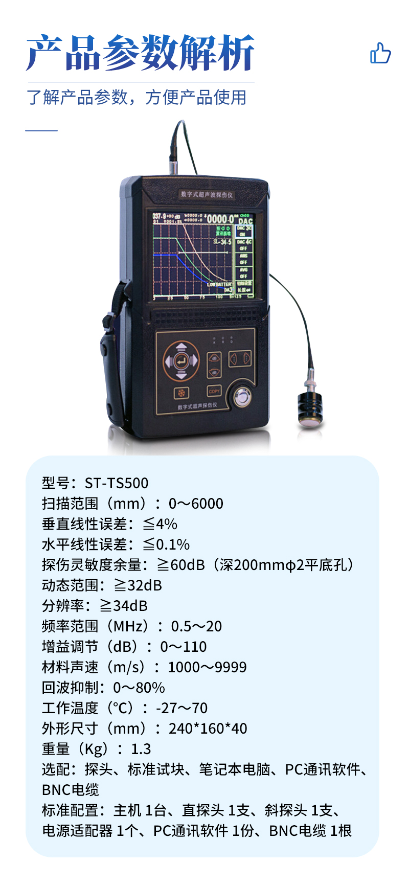 選配 | 探頭、標(biāo)準(zhǔn)試塊、筆記本電腦、PC通訊軟件、BNC電纜 |